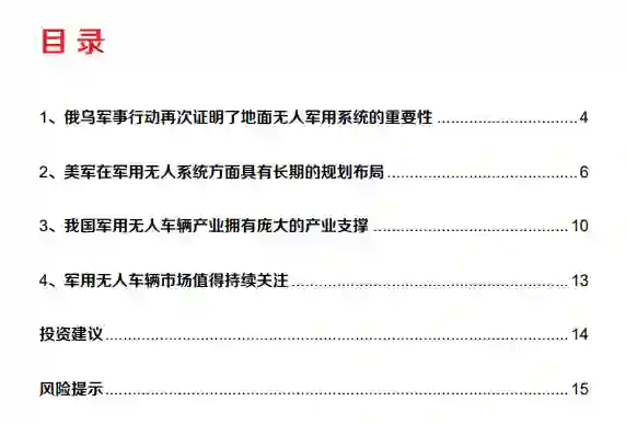 俄罗斯和美国等军事强国在军用无人车辆方面具备大量的技术型号积累、丰富的实 战经验和长期的官方主导的产业发展规划。俄罗斯研制了包括天王星-9 在内的多款 无人军用车辆,并且投入了实战。早在 2015 年,俄军就将一个带有实验性质的无人 平台连投入任务,并在俄叙联军行动中完成了包括直接杀伤在内的军事行动目标。 俄军表示,2025 年前其内部各类无人武器的装备比重将可能达到 30%,并专门成立 多个较大规模建制的无人作战单位,其内部不同的平台也将各司其职。美国制定的 长期无人军用系统发展规划,从需求、技术、培训、后勤等多方面指导引领产业发 展。美军对无人系统的发展具备严肃全面的关注和超长期的产业技术布局,至今发 展出了包括班组任务保障系统(SMSS)平台在内的多类型平台,并也投入实战。