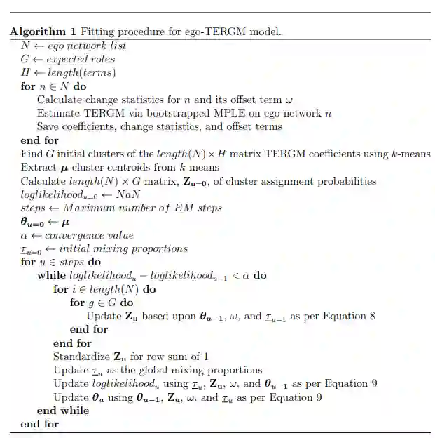 自我-时间指数随机图模型(ego-TERGM)是一种有限混合模型,它试图检测更广泛的纵向网络中每个自我网络组成的异质性。其方法是根据一组 TERGM 参数的相似性将每个 egonetwork 分配到一个群组中。这是通过使用基于混合模型的 TERGM 参数有限聚类的无监督潜类模型来实现的。换句话说,ego-TERGM 试图根据每个纵向自我网络(TERGM 模型参数)的相似性,将纵向网络(自我)中的一组节点聚类到预先确定的时间不变类(簇)中。