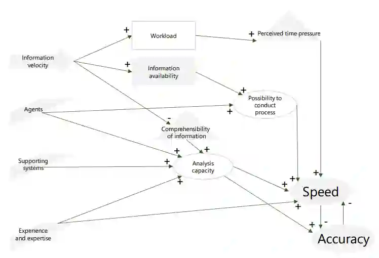 信息速度的影响既有消极影响,也有积极影响。积极影响包括信息可用性的提高,尽管这种影响只有在没有信息进行分析过程时才会显现。负面影响包括信息的可理解性降低,从而降低分析能力、速度和准确性。另外,当最后期限固定时,高信息速度导致的工作量增加要求智能体具有更高的速度水平。这种效应会导致结果的准确性降低,而在决策可能对人的生命造成高风险的情况下,这种结果往往是不可取的。