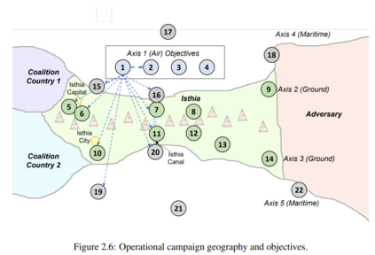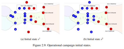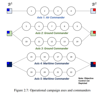 在第 2 章中,考虑了军事领导层准备并在必要时打击武装冲突的作战层面。开发了战役随机博弈(CSG),这是一种双人、贴现、零和随机博弈模型,用于军事战役中的动态作战计划。在每个阶段,博弈者都要管理多个指挥官,由他们下令对可通过现有补给线到达的目标采取军事行动。当为控制一个目标而发生战斗时,其随机结果取决于其他目标的控制所提供的行动和有利支持。每个玩家的目标都是最大限度地增加他们所控制目标的累计数量,并根据其关键性进行加权。为了解决这一大规模随机博弈,利用后勤和军事行动指挥与控制结构,推导出其马尔可夫完美均衡的属性。证明了最优值函数相对于部分有序状态空间的等调性,这反过来又导致了状态和行动空间的显著缩小。还通过消除受支配的行动和研究每次迭代求解的矩阵博弈的纯均衡来加速沙普利值迭代和范德瓦尔算法。在一个案例研究中展示了均衡结果的计算价值,该案例描述了一场具有地缘政治影响的作战级军事战役。分析揭示了均衡状态下博弈参数和动态之间复杂的相互作用,为战役分析师、作战计划人员和领导层提供了新的军事见解。