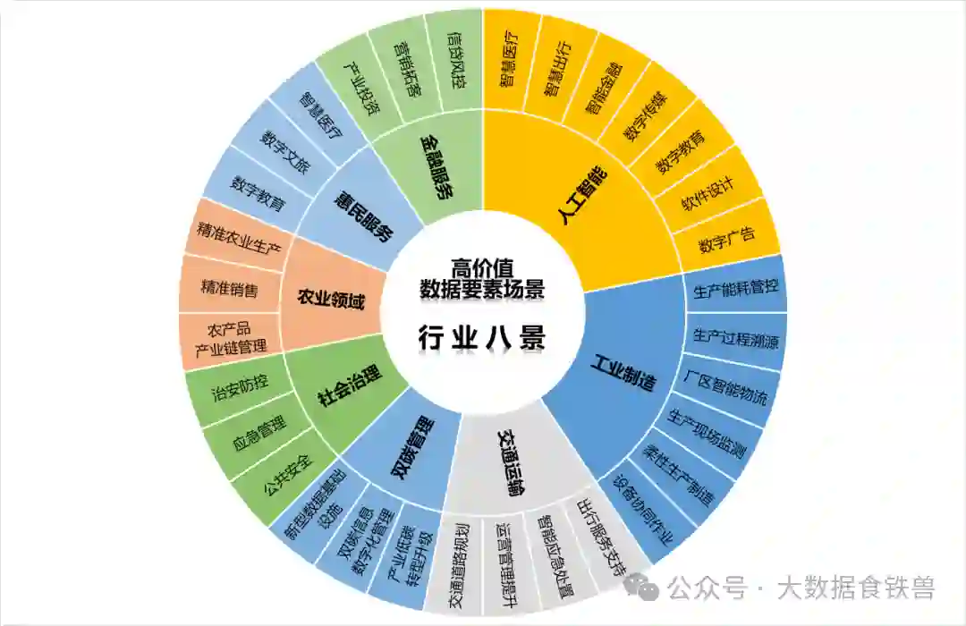 图2 高价值数据要素场景“五脉”实施路径 **三是高价值数据要素场景的“行业八景”。**报告根据行业数据要素场景建设理念和政策要求,结合已成功实施的数据要素典型应用案例,运用“技术成熟度高、组织统筹力度大、数据应用程度深、切中行业发展关切”的分析思路,聚焦人工智能、工业制造、交通运输、双碳治理、社会治理、农业领域、惠民服务、金融服务等八个方面,提出高价值数据要素场景的“行业八景”。