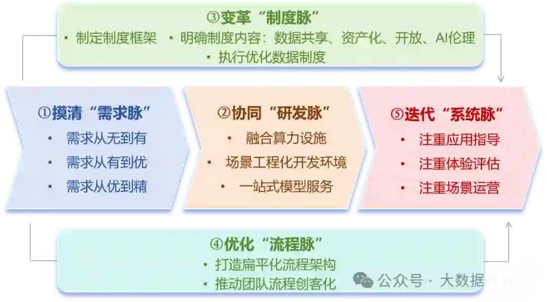 图1 高价值数据要素场景“四度”特征模型 **二是高价值数据要素场景建设需要秉持“五脉”实施路径。**高价值的数据要素场景,并不只是简单的考虑新技术应用,也不是单一的数据架构搭建和全周期管理,而是需要从需求采集、协同研发、机制设计、管理流程、商业模式等多维度视角出发,构建体系化的“五脉”实施路径。具体而言,要做好如下五点:摸清需求脉,坚持从行业用户来,到场景中去。协同研发脉,共建共享环境,走向大模型。变革制度脉,以数据为中心,建立软框架。优化流程脉,适应组织变化,提升团队主动性。迭代系统脉,以体验促通达,先立而后破。