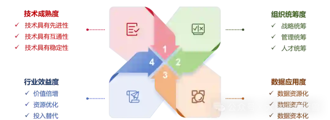 **一是高价值数据要素场景的“四度”特征。**基于腾讯、中国电子等企业在数据要素开发利用中积累的行业经验,研究团队对市场认可度较高、已经形成价值闭环的数据要素场景进行了分析提炼,提出了数据要素场景的“四度”分析框架,即:技术成熟度、组织统筹度、数据应用度、行业效益度。这个分析框架既可以作为检验数据要素场景的价值标尺,又可以为政策支持方向选择提供方法论参考。
