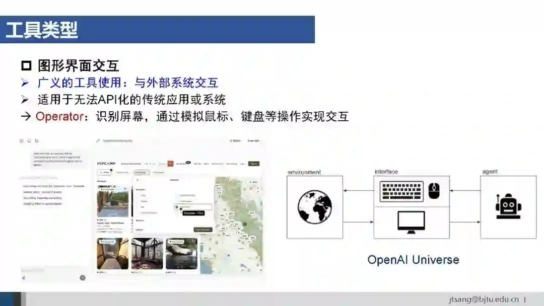 AI Agent可调用的工具主要有API接口、数据库和知识库、外部模型等。对于无法API化的外部系统,可以将图形界面交互也封装成工具供Agent调用。