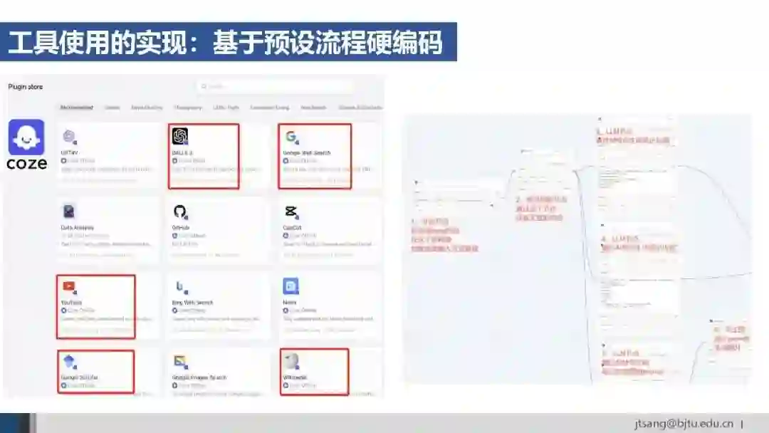 使用工具的第一种方式是**系统层的预设流程,**即通过硬编码方式定义Agent的行为逻辑。 优点是确定性强、可靠,但缺乏灵活性、难以应对开放性和动态变化的环境。字节的Coze是典型的通过设计工作流搭建Agent的平台。
