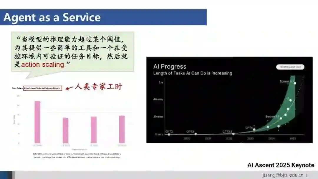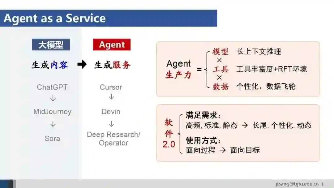 OpenAI开始用可替代的人类专家工时评估模型的能力,这表明agent逐步作为一种服务成为生产力。 Agent的生产力由模型智能、工具多样性和数据专业性三个因素决定。应用层不仅要承接最新模型成果,还需要从工具和数据两个方面向下优化模型。 与chatbot失效的数据飞轮不同,在agent阶段,普通用户的行动流数据对于提升模型能力还是有用的,所以AI Agent产品目前仍然存在数据飞轮。OpenAI收购Windsurf,很大程度上是看重其丰富的开发者agentic行为数据。对比传统软件通过需求分析确定高频、标准、静态的需求,基于Agent的服务可以满足长尾、个性化、动态的需求。基于Agent的新一代软件的界面可能被高度简化为一个对话框,传统复杂的操作过程被隐藏,成为面向目标的服务交付。