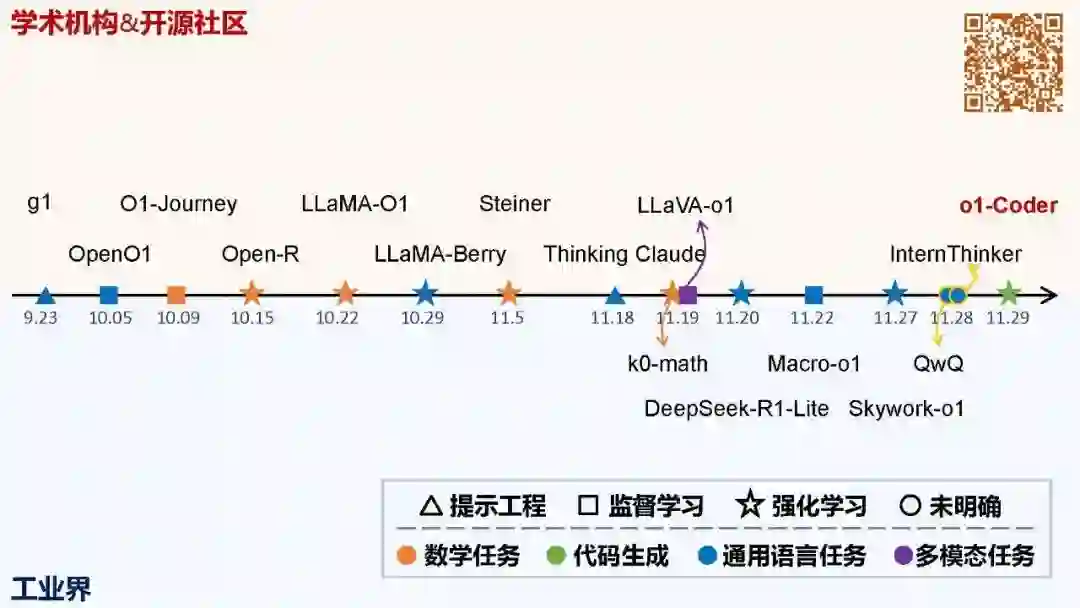o1首次展示了基于学习的推理模型的潜力。 之后学术界和开源社区出现了大量复现工作。和预训练需要大规模集群不同,推理模型的学习聚焦后训练阶段,算力资源的门槛相对较低。而且,预训练算法在GPT-3.5之前基本都开源了,加上ChatGPT发布后一年多的时间,大家摸索地七七八八了。但后训练、特别是用强化学习训练大语言模型,有大量待探索的工作。学术界觉得自己又行了。