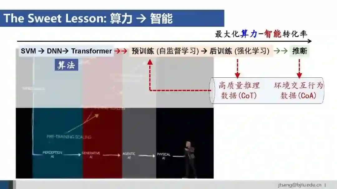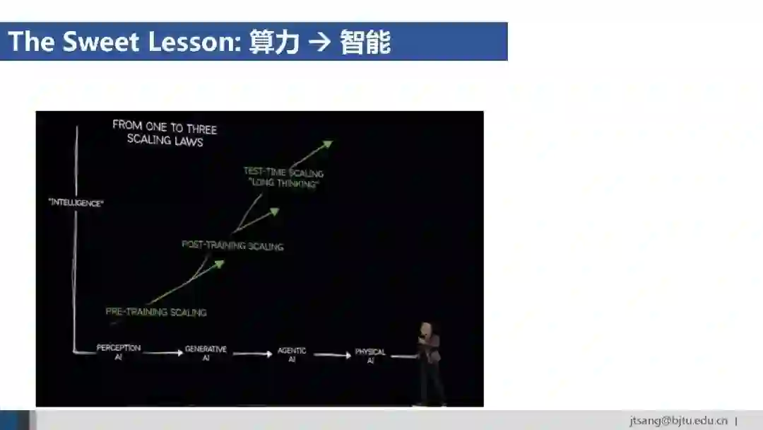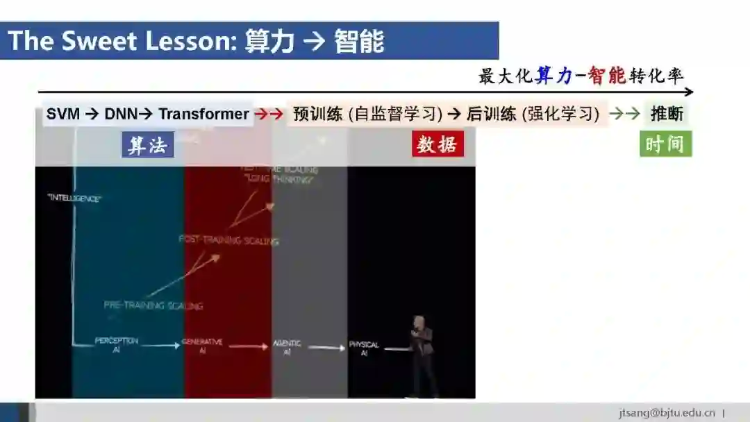 回到黄仁勋的主题演讲。 预训练、后训练、推断三阶段的scaling law,支撑着目前生成式AI和Agentic AI的发展。 这背后是从算力到智能的sweet lesson。随着算力每年增长4-5倍,近十年的算力已经提升了百万倍。当算力资源成为主要的推动因素,AI发展的一条暗线是:如何将越来越多的算力以最高的效率转化为智能的提升。这一过程分成了三个阶段。早期从SVM到DNN再到Transformer,是从算法侧消化算力,能在大量数据上训练大规模参数的模型,可以说到Transformer已基本收敛了。接下来解决的是如何提供源源不断的数据。这包括了预训练基于自监督学习可以吃掉整个互联网的数据,以及后训练结合强化学习将算力转化为高质量的合成数据。AI Agent是这一线索的延续:在推断阶段,用更多时间消耗更多算力,进一步提升智能水平。