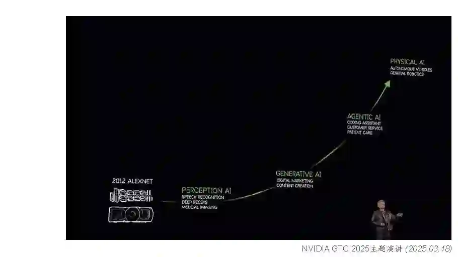 黄仁勋在英伟达GTC2025的主题演讲中回顾了AI过去十几年的发展。从2012年AlexNet开始的深度学习,到近几年大模型推动的生成式AI,再到当下正经历的Agentic AI,直到未来的Physical AI。