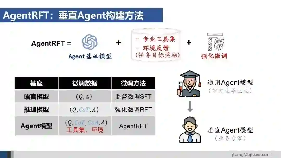 对o3等agent基础模型微调获得垂直agent的通用公式是:准备完成任务所需的专业工具集、受控环境内可验证的任务目标,然后进行强化微调。 随着o3、Qwen3等Agent基础模型成熟,就好像高素质的研究生毕业生供应增加。企业需要接下来结合具体任务继续培养,在特定工作上训练成为业务专家。 端到端训练垂直Agent,已经在广告(ICON)、网络安全(XBOW)、软件开发(Traversal)等领域有了成功案例。