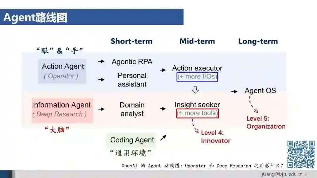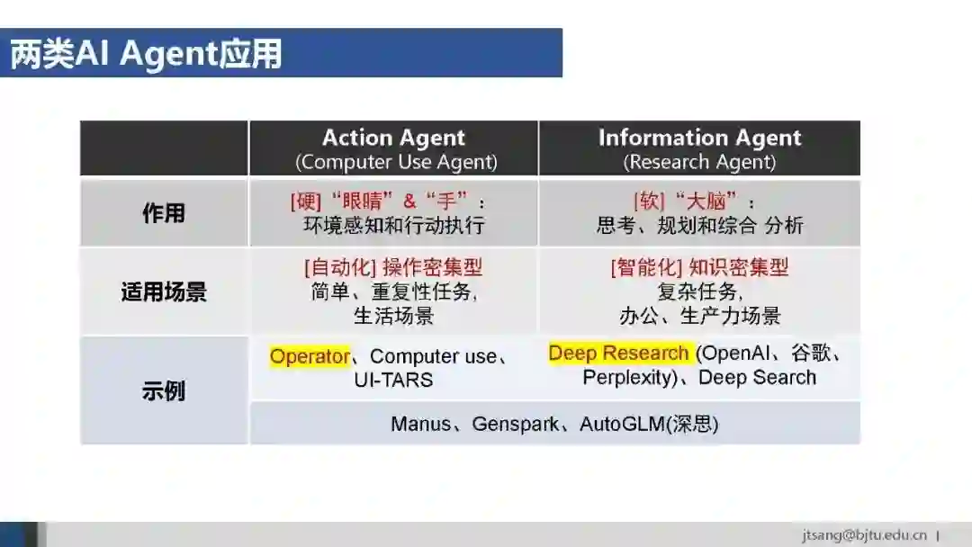 3. AI Agent应用Operator和Deep Research代表了目前AI Agent的两个主要应用方向:操作action agent和信息information agent。前者扮演“眼和手”的角色,擅长环境交互与自动化操作,适用于重复性强的操作密集型任务。后者扮演“大脑”的角色,擅长知识整合与复杂分析,适用于知识密集型任务。