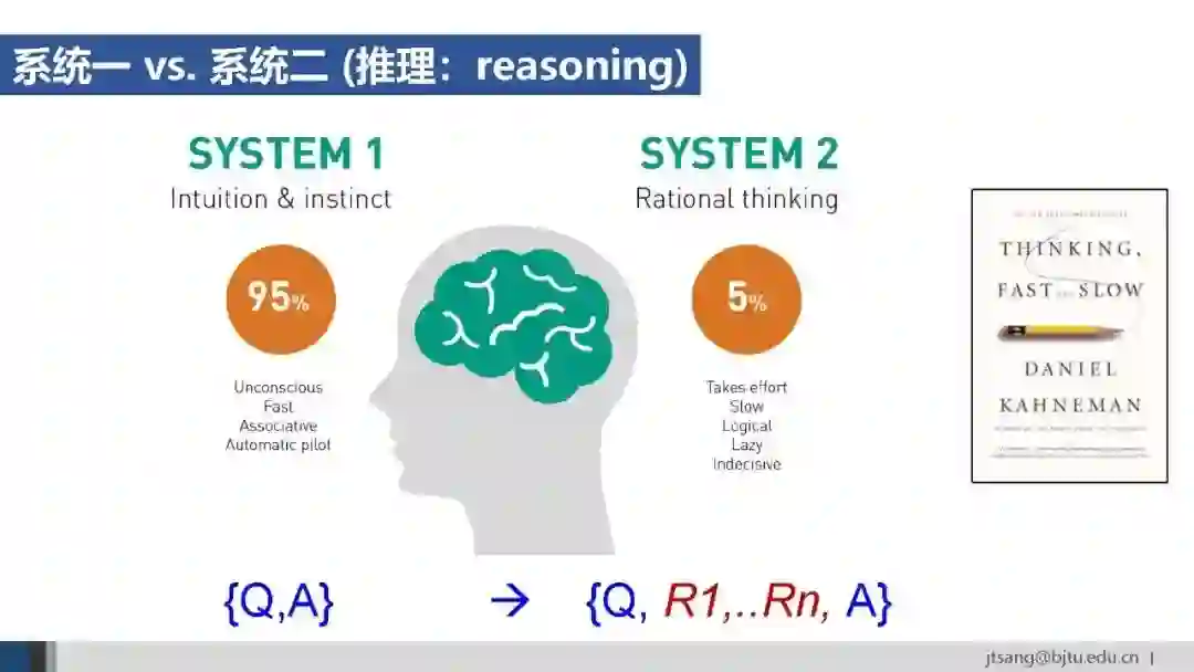 任务规划与人类的系统二能力紧密相关。按照心理学理论,系统一代表直觉,从Q直接到A,属于“快思考”;系统二从Q到A之间增加了多步的逻辑推理,属于“慢思考”。(区分推理和推断:推理reasoning是指模型通过多步骤、结构化的中间过程来得出结论;而推断inference泛指模型生成输出结果的过程,可能基于推理、也可能不基于推理)。