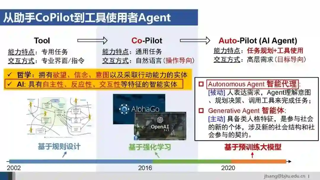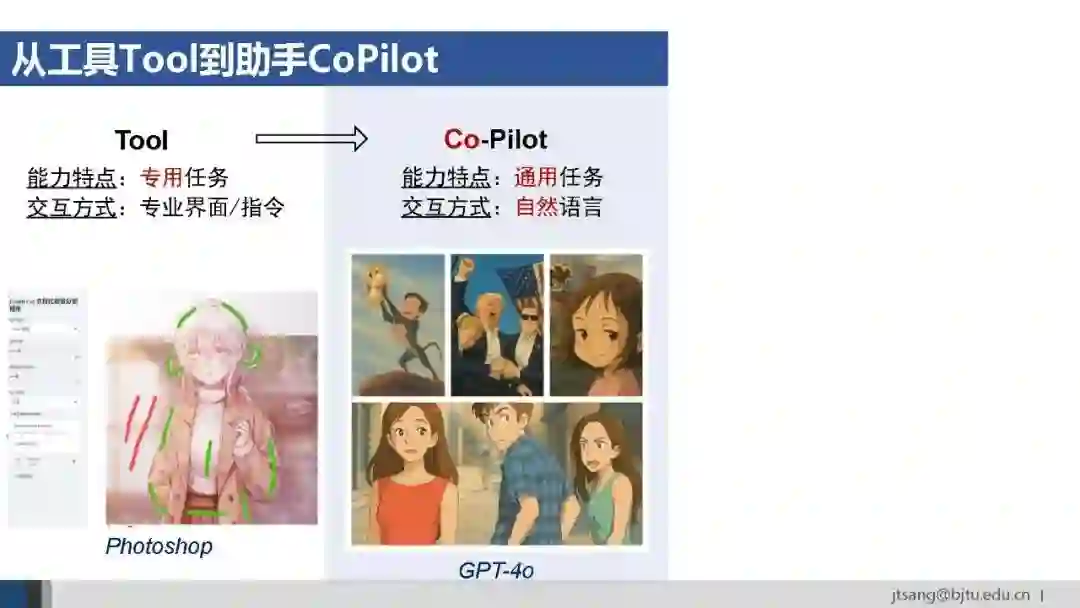 在大模型之前,以专家系统、传统机器学习和传统深度学习为代表的AI,依赖专业界面和指令,解决专用任务。比如用Photoshop进行交互式抠图。这一阶段的AI和人类历史上每次技术革命一样,提供的是被人类使用的工具。大模型带来的通用任务解决能力和自然语言交互界面,使AI成为人机协作的副驾驶Co-Pilot。比如GPT-4o支持基于自然语言指令生成图片、抠图、风格迁移等。不过,此时仍需人类给出明确、具体的指令:人指挥一步,AI执行一步。