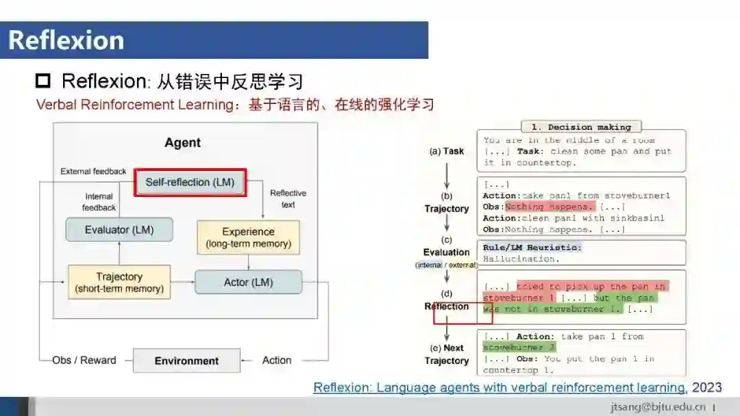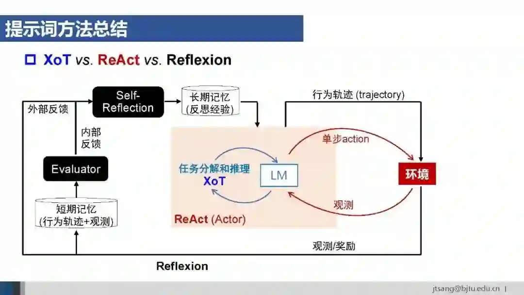 Agent框架使用的提示词方法包括ReAct、Reflexion等。任务规划使用的XoT关注模型内部行为,ReAct通过使用工具与外部环境交互,Reflexion则进一步结合整个行为轨迹,支持Agent从错误中学习并改进行动策略。