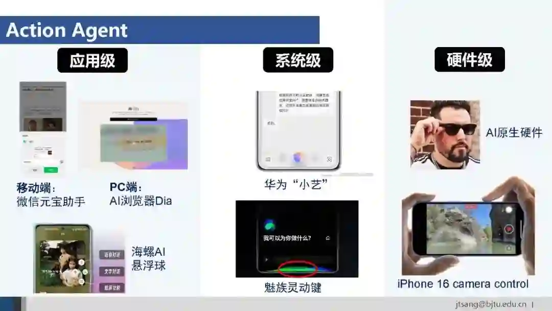 Action agent目前主要在各类终端上。Agent入口的层级从高到低有应用级、系统级和硬件级。 微信将元宝直接放到联系人中,再次体现了腾讯作为连接器的定位:通过微信连接人和信息-公众号,连接人和服务-小程序,甚至连接任何交易-微信支付。 终端agent应该具备自然交互、自动化、个性化三个特点。分别对应了感知、认知和记忆三方面主要能力。