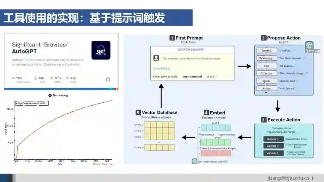 另一种实现方式是**模型层的提示词触发,**引导模型选择合适的工具。这种方式更加灵活,适用于基于局部上下文的任务决策。AutoGPT是早期代表性的基于提示词的Agent框架。