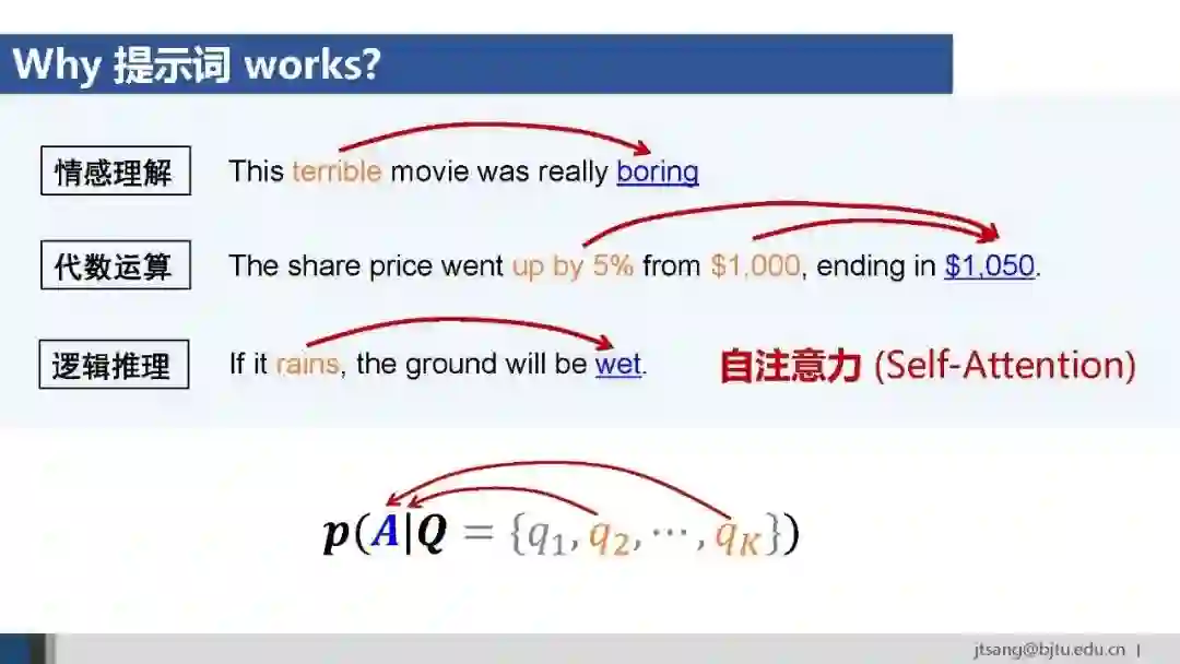 大模型从预训练的多任务学习中学到了捕捉上下文关联的自注意力,提示词相当于在推断阶段增加了一个“条件层”,让模型在进行推断时参考示例中的推理结构,影响其生成结果。