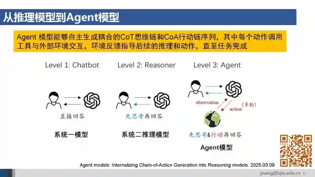 3月初的论文给agent模型下了一个定义。 与LLM和推理模型的人-模型二元结构不同,agent模型要求能够同时进行思考与行动,形成了由人、模型和环境构成的三元结构:使用工具与环境进行交互以获得反馈,经过多轮的思考、行动和观察后,最终生成回复。