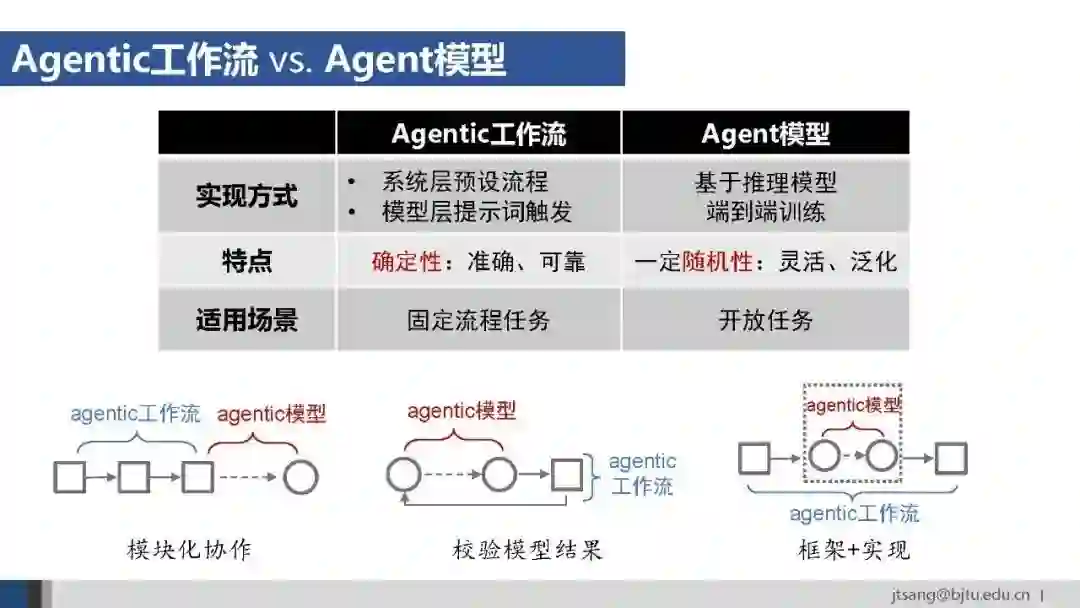 Agent模型探索能力上限,Agentic工作流保证任务执行下限,二者在很长时间内将结合使用。 三种可能的结合方式:(1)模块化协作,确定性流程使用工作流,灵活性需求使用Agent模型;(2)校验模型结果,通过工作流对Agent模型的输出进行校验,减少模型的随机性和幻觉不确定性等问题;(3)框架+实现,工作流搭建顶层确定框架,模型实现底层灵活和智能。