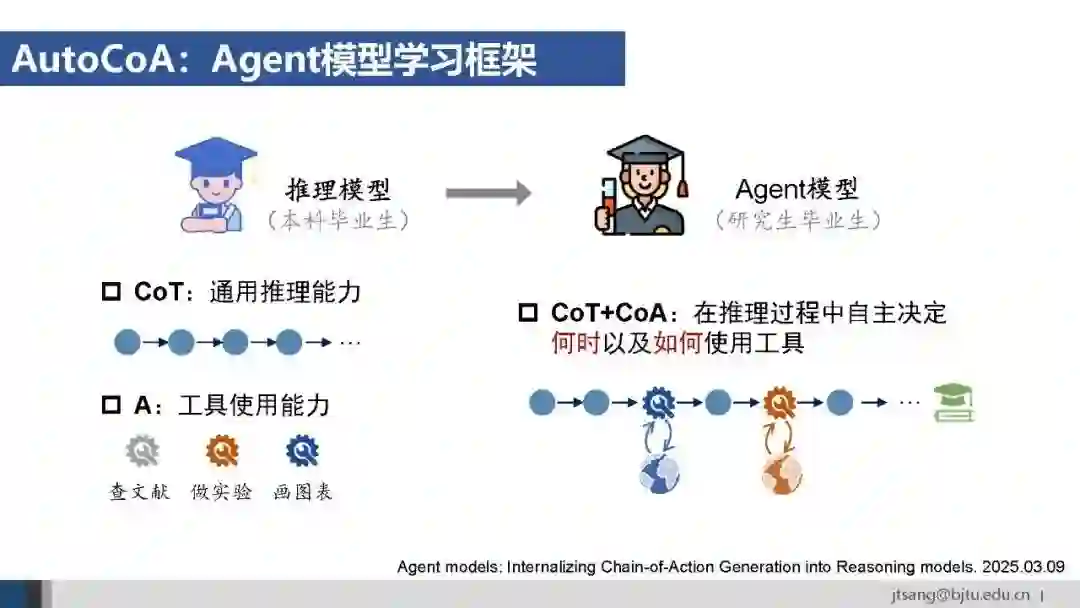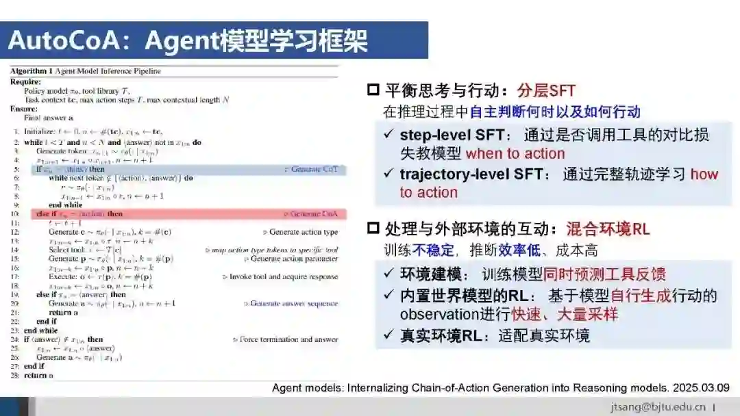 推理模型已经具备了通用推理能力和单点的工具使用能力。Agent模型训练旨在面向任务目标,端到端训练模型在推理过程中的链式工具使用能力。 如同研究生通过完成学位论文,才能掌握如何整合查阅文献、做实验、绘制图表这些单个技能完成一个复杂的任务。 Agent模型学习框架需要平衡思考与行动,并处理外部环境交互带来的训练不稳定和效率低成本高的问题。 AutoCoA设计了分层SFT,将模型行动的when和how两个能力拆解;并提出了混合环境RL,训练策略模型自己模拟环境反馈。