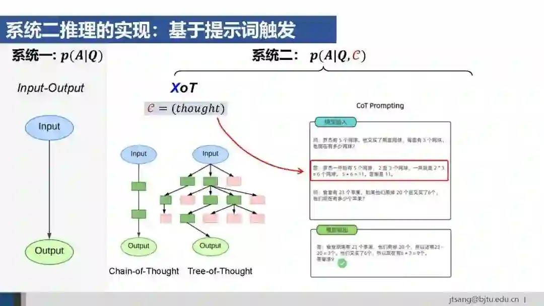 要让大模型实现系统二的推理能力,第一种方法是提示词。 比如思维链CoT、思维树ToT等方法,提供少量包含推理过程的样本示例,激发模型In-Context Learning上下文学习,在线调整其推断行为。