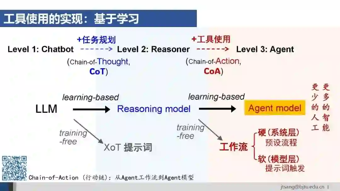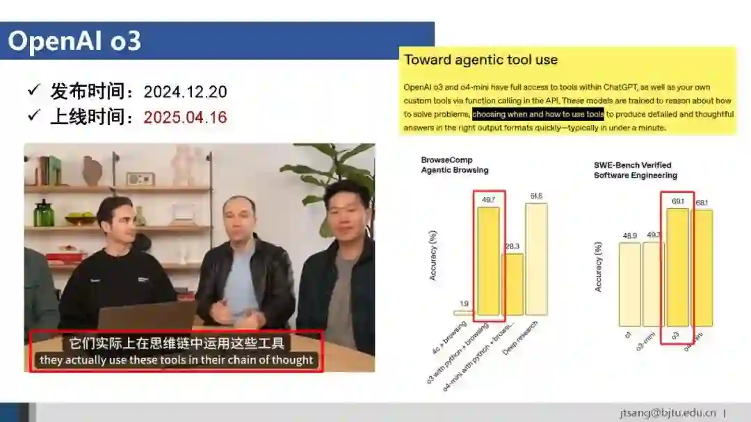 与推理能力类似,工具使用(在推理链中使用工具,Chain-of-Action,CoA)也可以通过学习的方式内化到模型中。 将预设流程和提示词触发两种方式统称为工作流。根据“更少的人工,更多的智能”的原则,基于学习得到的Agent模型应该具有更高的上限。 基于端到端学习的Agent模型o3于4月16日正式上线。Greg Brockman在介绍时明确说o3学习“在思维链中使用工具”。