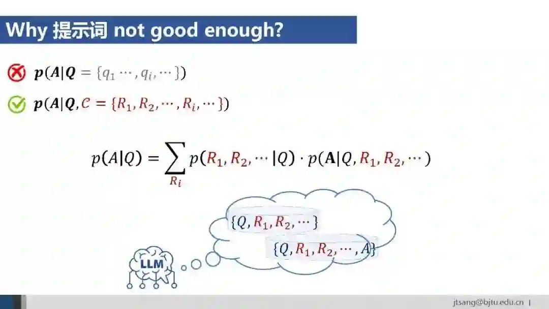然而,互联网语料主要是 (Q, A) 的形式,这意味着自注意力中学到的上下文关联是在问题和答案之间的。而推理需要捕捉推理过程和答案之间的关联。在推理过程上将p(A|Q)展开后,可以看得很清楚。 因此,最直接的方式还是构造含有推理过程的数据,通过学习将推理能力内化进到模型里。