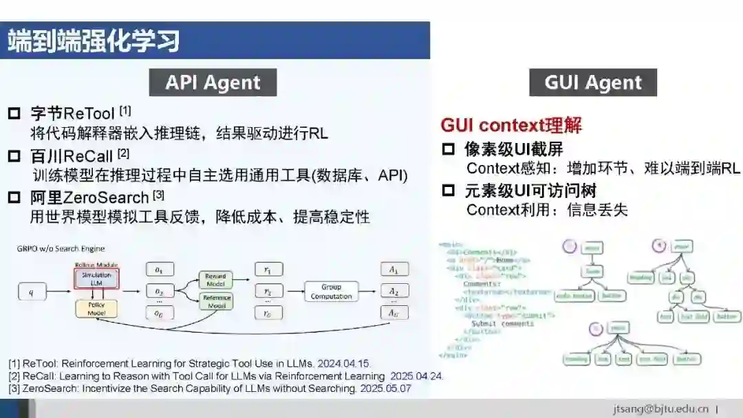 AutoCoA的框架主要面向的是API Agent。从4月中旬开始,几个大厂密集发布的工作,也证明端到端RL在API Agent上是跑得通的。 但在GUI Agent上,强如字节的UI-TARS,RL也只能在单步行动上训练。 问题可能出在是对GUI context的理解上:截屏的方法增加了感知环节,使得端到端训练难以进行;可访问树的方法由于信息丢失,会影响上下文信息的利用。