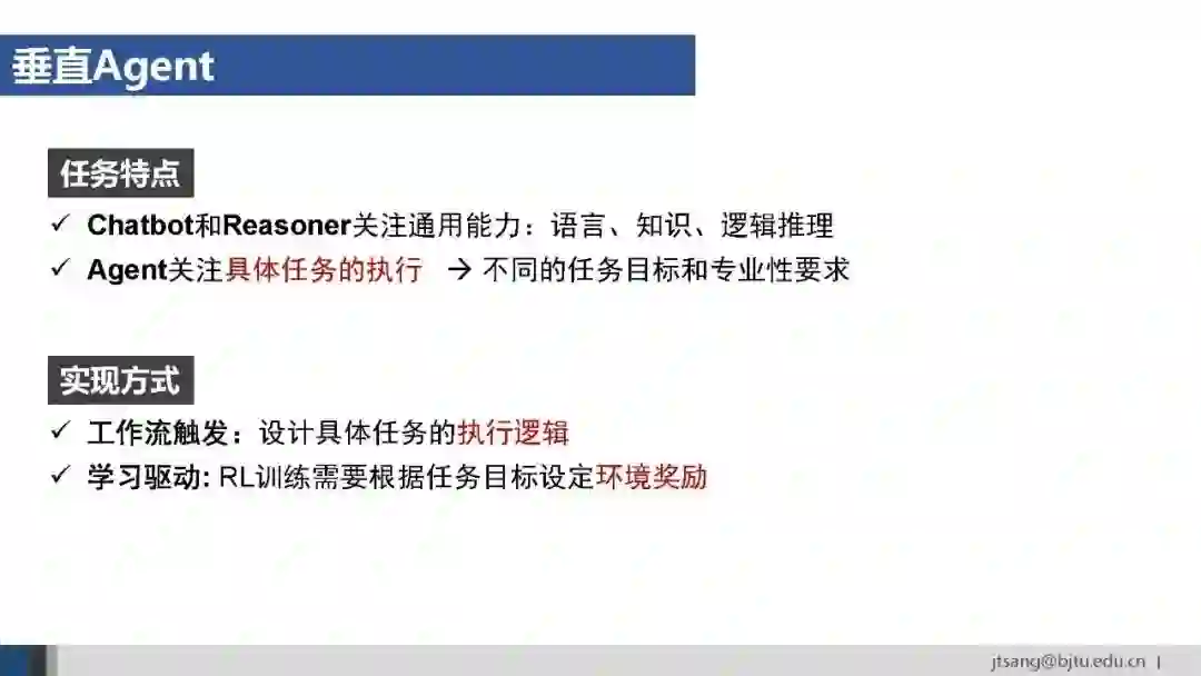 关于AI Agent应该通用还是垂直的讨论。 从任务特点看,agent与chatbot和reasoner不同,关注的是具体任务的执行,这也是“AI下半场”的另一种解释:从刷通用能力的benchmark到解决具体任务。从实现方式看,工作流的方法需要面向任务设计具体的执行逻辑;基于RL学习的方法,则需要根据任务目标,设定准确的环境奖励。
