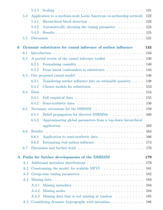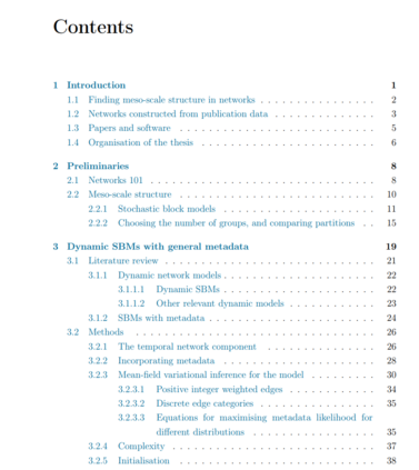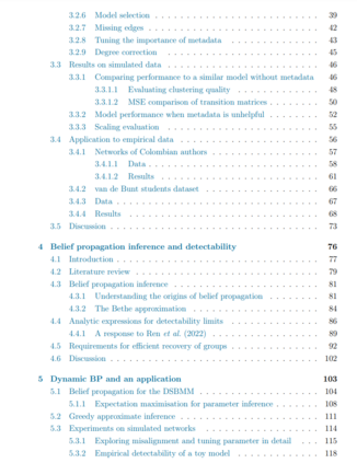 尽管这种元数据可能有潜在的用途,但直到最近才开始将网络和元数据共同建模的方法。在本论文中,我们提供了一类新的模型,旨在找到随时间变化的网络中的群组。我们描述了该类模型的不同版本,允许网络具有加权和有向性,并避免了将具有相似度数的节点放入同一组的潜在问题。 除了详细说明这些模型外,我们还推导了在存在元数据的情况下,有效检测群组的新要求,并解释了为什么一篇最近的论文声称在类似的静态模型中实现了相同的效果,但存在缺陷。我们利用的推理方法也具有高度可扩展性,我们通过提出一种“贪婪”方案和一种递归过程进一步加速了这个过程,有效地提供了网络群组的自顶向下层次结构。