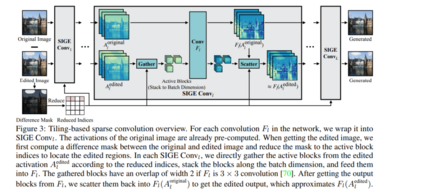 在图像编辑过程中,现有的深度生成模型倾向于从头重新合成整个输出,包括未编辑的区域。这将导致严重的计算浪费,特别是对于较小的编辑操作。在这项工作中,我们提出了空间稀疏推断(SSI),这是一种通用技术,可选择性地对编辑区域执行计算,并加速各种生成模型,包括条件GANs和扩散模型。我们的主要观察结果是,用户倾向于对输入图像进行渐进的更改。这促使我们缓存和重用原始图像的特征映射。给定一个编辑过的图像,我们对编辑过的区域稀疏地应用卷积滤波器,而对未编辑的区域重用缓存的特征。基于我们的算法,我们进一步提出了稀疏增量生成引擎(稀疏增量生成引擎,SIGE),将现有硬件上的计算减少转化为延迟减少。在1.2%的编辑区域中,我们的方法在保持视觉保真度的同时,减少了7.5× DDIM和18× GauGAN的计算。利用SIGE,我们将DDIM在RTX 3090和Apple M1 Pro CPU上的推理时间分别提高了3.0×和6.6×,将ggaan在RTX 3090和Apple M1 Pro CPU上的推理时间分别提高了4.2×和14×。