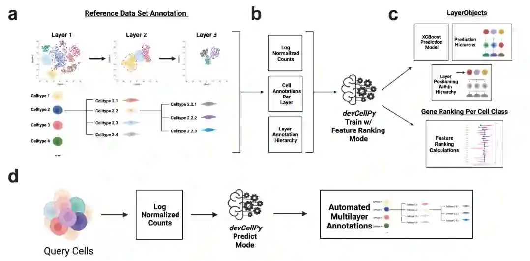 为了解决这些挑战,作者提出了基于Python的发育细胞预测(devCellPy)工具,用于从任何组织或物种获得的高度复杂的注释层次结构中自动预测细胞身份。devCellPy预测模型的基础是极端梯度提升(XGBoost),这是一种有监督的机器学习方法,通过使用一系列梯度增强的决策树集成来学习创建精确预测所需的输入特征集。DevCellPy通过学习特定参考数据集的注释层次结构和创建预测模型以全自动化的方式跨所有注释层对细胞进行分类,其在细胞标识的自动化分配方面取得了重大进展。重要的是,该算法允许将时间点变量合并到注释层次结构中,因此,可以对限定时间段内出现的细胞标识进行分类。