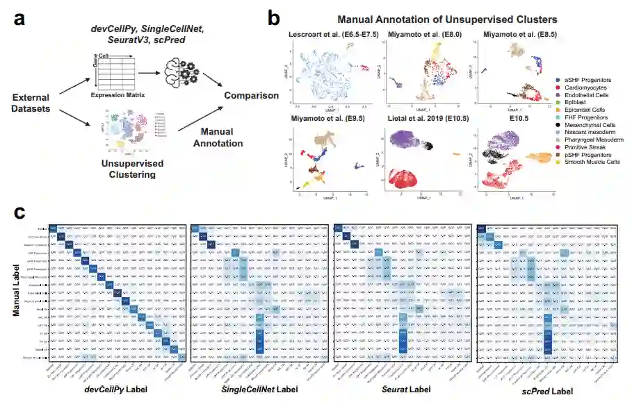 为了进一步评估devCellPy的性能,验证devCellPy生成的预测算法是否能够成功预测以前数据集中没有遇到过的细胞类型。作者分析了来自三个新来源的scRNA-seq数据,并从E10.5小鼠心脏中生成了新的数据,并测试了devCellPy对心脏图谱中存在的所有细胞类型进行全自动预测的能力。同时,作者进一步评估了其他细胞预测算法对心脏图谱中所有细胞类型进行完整分类的能力(图4a、b)。作者将机器学习分类与查询数据集的无监督聚类注释期间分配的手动注释进行了比较(图4b),手动注释和devCellPy预测的比较显示,两种注释方法在17个细胞类别中的11个中具有高度的一致性,准确率达80%(图4c)。