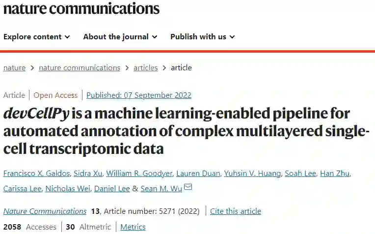 参考资料 Galdos, F.X., Xu, S., Goodyer, W.R. et al. devCellPy is a machine learning-enabled pipeline for automated annotation of complex multilayered single-cell transcriptomic data. Nat Commun 13, 5271 (2022). https://doi.org/10.1038/s41467-022-33045-x