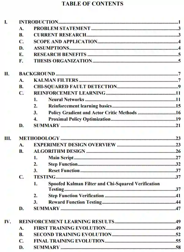 第1章概述了所进行的研究,描述了卡尔曼滤波、chi-squared测试和网络物理系统之间的关系。第2章提供了关于卡尔曼滤波器chi-squared故障检测和本研究中使用的RL方法的支持信息。第3章描述了用于建立CPS模型的方法,详细描述了RL算法,并涵盖了对算法功能的测试和验证。第4章介绍了研究的结果。第5章详细介绍了结论和未来的研究领域和适用性。