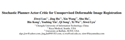 该论文创新性地提出了一种具有随机策略的计划者-执行者-评论家强化学习模型。该模型可有效解决强化学习模型因状态空间和动作空间过大而无法处理图像柔性配准问题的缺陷,是国际上首次提出使用强化学习完成图像柔性配准的工作。本文在多种医学图像配准数据集上对该方法进行评估,实验结果表明此方法超越了当前该领域的先进模型,具有优异的配准效果。