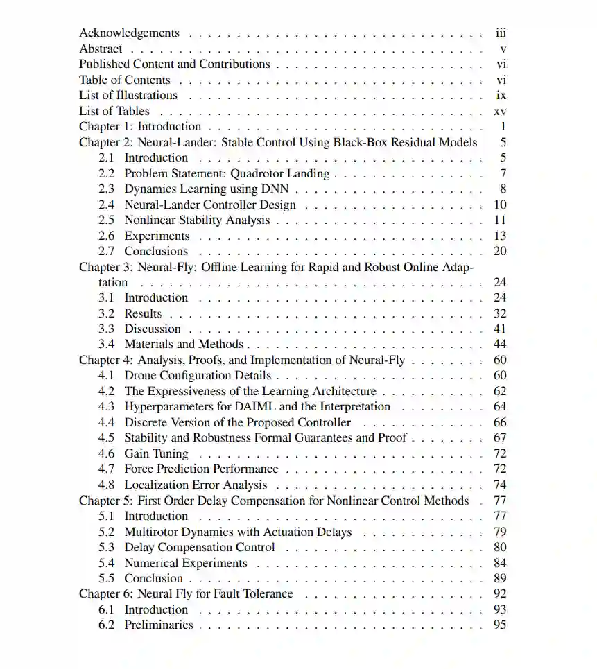 这篇论文解决了通过引入新颖的基于深度学习的方法来提高多旋翼无人机在各种挑战性条件下的控制、安全性和可靠性的总体问题。这些方法旨在解决多旋翼无人机在运行中面临的特定问题,如近地轨迹控制、高速风干扰、执行延迟和电机故障。论文分为四个主要章节,外加引言和结论。每个主要章节都侧重于解决深度学习基控制方法的一个特定挑战。第二章介绍了神经着陆器(Neural-Lander),这是一个基于深度学习的鲁棒非线性控制器,通过考虑复杂的空气动力效应显著提高了四旋翼无人机的着陆控制性能。本章解决了将学习到的残差动力学整合进控制架构的关键挑战,为后续章节奠定了基础。第三章和第四章介绍了神经飞行器(Neural-Fly),这是一个基于学习的方法,它使用域对抗不变元学习(DAIML)和自适应控制来实现快速在线学习和在广泛风力条件下的精确飞行控制。第五章提出了一种轻量级增强方法,通过有效补偿电机动力学和数字传输延迟来提高无人机的轨迹跟踪性能。这种方法可以扩展到一系列控制方法,包括基于学习的方法。第六章探索了一种新颖的稀疏故障识别方法,用于检测和补偿超驱动无人机的电机故障,为开发更安全、更可靠的运行的鲁棒故障检测和补偿策略做出了贡献。这种方法建立在神经飞行器在线学习框架的基础上,并将其扩展到包括完全执行器故障在内的更广泛的条件。这些章节共同解决了基于学习的安全可靠控制的关键挑战,并展示了基于深度学习的控制方法的潜力。