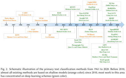 主要文本分类方法的示意图如图2所示。从20世纪60年代到21世纪10年代,基于浅层学习的文本分类模型占据了主导地位。浅层学习意味着在乐此不疲的模型,如 NaÃŕve Bayes(NB)[10], K-近邻(KNN)[11],和支持向量机(SVM)[12]。与早期基于规则的方法相比,该方法在准确性和稳定性方面具有明显的优势。然而,这些方法仍然需要进行特征工程,这是非常耗时和昂贵的。此外,它们往往忽略文本数据中自然的顺序结构或上下文信息,使学习词汇的语义信息变得困难。自2010年代以来,文本分类逐渐从浅层学习模式向深度学习模式转变。与基于浅层学习的方法相比,深度学习方法避免了人工设计规则和特征,并自动提供文本挖掘的语义意义表示。因此,大部分文本分类研究工作都是基于DNNs的,这是一种计算复杂度很高的数据驱动方法。很少有人关注于用浅层学习模型来解决计算和数据的局限性。