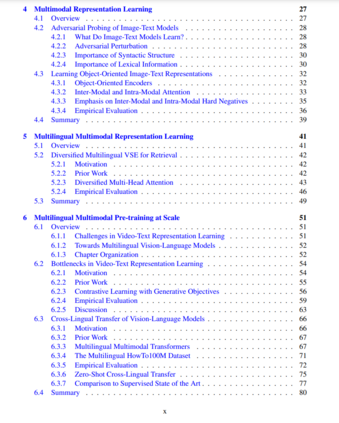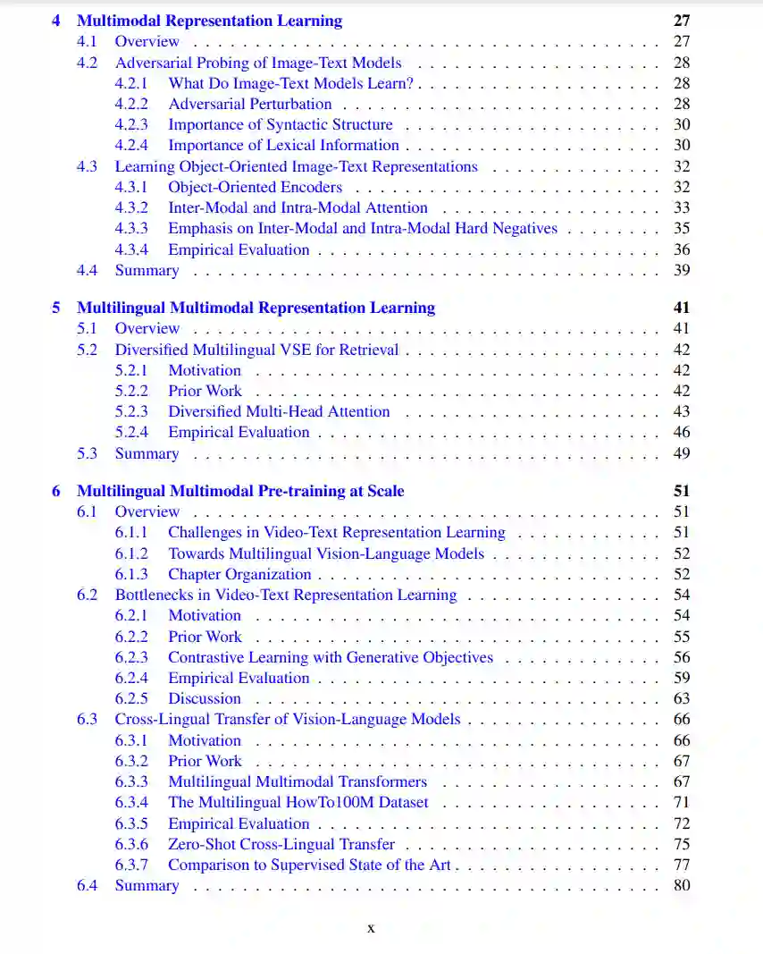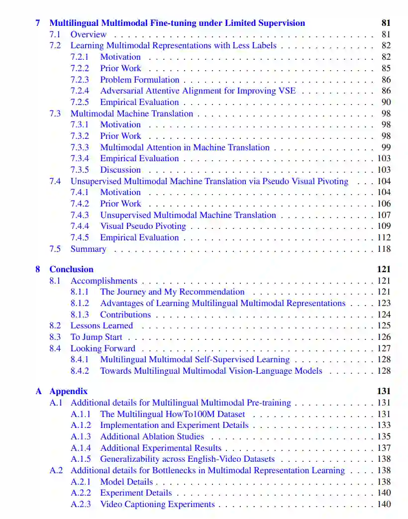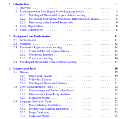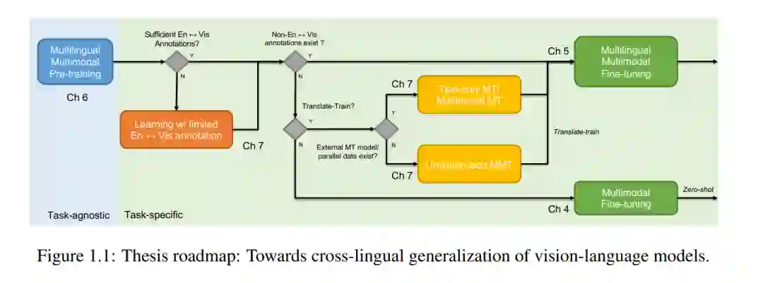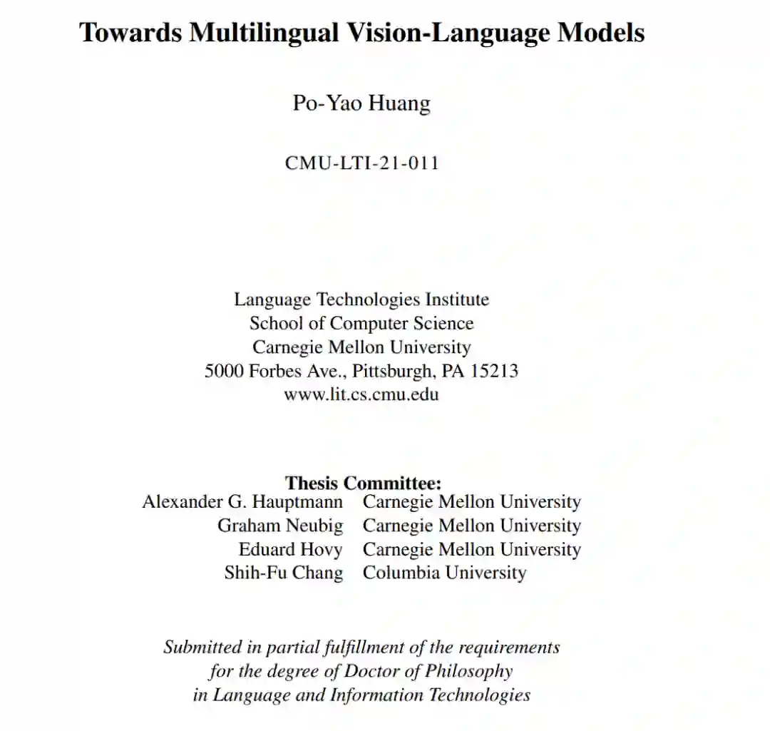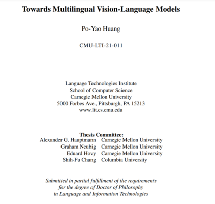 **近年来,随着用户生成的多模态数据的爆炸式增长,学习多模态表示已经使许多新颖的视觉语言应用成为可能。**虽然全球大约有6500种语言,但大多数视觉语言模型及其数据集都是基于英语的。不幸的是,这种限制阻碍了当前的模型造福于更广泛的非英语社区。因此,开发基于英语的视觉语言模型泛化到非英语语言的方法是迫切而有益的。我的论文工作在这一挑战的多个方面取得了进展,通过探索学习多语言多模态表示的新兴趋势,促进了对各种语言的图像、视频和文本等异构内容的建模和推理。在本文的第一部分中,我指出了现有英语图像表示学习的局限性,为广义多语言多模态表示学习铺平了道路。虽然之前的工作主要是将整个图像与相应的英文标题相关联,但我认为这种对应应该更加精细,甚至是多语言的。结果表明,基于注意力和面向对象的多语言多模态表示学习方法可以有效地改进跨模态搜索和多模态机器翻译等终端任务。**本文的第二部分研究了视觉-语言模型的跨语言泛化。本文解决了大规模任务无关的多语言多模态预训练中的可扩展性挑战,以及在对最终任务进行微调时缺乏注释的挑战。**为了用有噪声的百万规模的未经整理的教学视频及其各种语言的转录进行学习,我分析了多模态自监督学习中理想的支持集大小,并提出了一个重建目标来缓解这种瓶颈。此外,我探索了多语言多模态预训练并构建了Multi-HowTo100M数据集,该数据集由1.2亿个视频片段及其在9种语言中的转录组成,以改善视觉-语言模型的零样本跨语言迁移。最后,在特定任务的微调中,利用自动视觉语义来学习稀疏的英语视觉注释。当非英语标注稀缺或不可用时,本文研究了视觉旋转监督和无监督多模态机器翻译,将英语视觉数据翻译为非英语视觉数据,以进行多语言多模态微调。本文的工作为增强视觉-语言模型的跨语言泛化能力带来了显著的突破。我相信所提出的方法和释放的资源将是迈向多语言视觉-语言模型的关键一步。