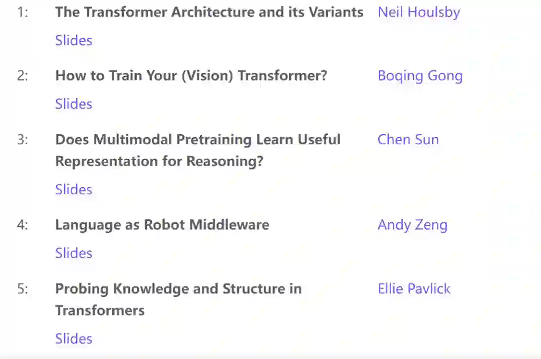 **本教程旨在从Transformer架构的角度,分享统一神经架构的令人兴奋的最新进展,这些架构可以处理不同的输入模态,并学习解决不同的任务。**其目标是让与会者“了解关于Transformers的一切”。本教程涵盖了基本架构及其最新变体(Neil Houlsby),有效的优化算法(Boqing Gong),多模态学习和机器人领域代表性和新兴的新应用(Chen Sun, Andy Zeng),以及探索和分析训练网络捕获了什么知识的工具(Ellie Pavlick)。