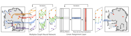 为了实现全局规划之间的连续性,我们额外加入了两类辅助节点,历史机器人位置(history robots)和历史目标位置(history goals)。通过多路图神经网络(Multiplex Graph Neural Network),我们提取机器人和前沿点之间的距离代价,作为二分图匹配的关联矩阵(Affinity Matrix)。基于关联矩阵,我们使用线性分配层(Linear Assignment Layer)进行可微匈牙利算法(Differentiable Hungarian Algorithm),从而得到二分图匹配,即每个机器人分配一个前沿点作为目标位置。