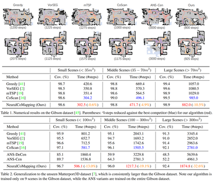 我们在 iGibson 模拟器使用 Gibson 和 Matterport3D 数据集进行实验。具体地,我们在 Gibson 数据集随机选取9个场景进行训练,把剩余场景和 Matterport3D 数据集的场景用作测试。结果表明,与其他多机协同算法相比,我们提出的 NeuralCoMapping 在全局时间效率上具有显著优势。测试场景面积越大,NeuralCoMapping 表现出来的优势越明显。在 Matterport3D 场景中的测试结果也表明 NeuralCoMapping 对不同类型场景有很好的泛化性。