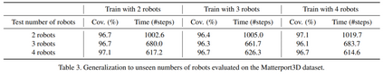 此外,NeuralCoMapping 在不同机器人数量上也表现出很好的泛化性。在三个机器人之上训练的模型,仍然能够直接应用在二或四个机器人之上(附加材料包含了多至九个机器人的泛化性实验),这归功于我们算法的层次设计:我们将复杂的全局规划问题抽象为对机器人数量不敏感的二分图匹配问题,从而能够利用多路图神经网络,使算法运行在任意数量的机器人上。