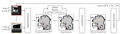 NeuralCoMapping 算法由四个模块组成:建图模块(Mapping Module),全局规划器(Global Planner),局部规划器(Local Planner)和动作控制器(Action Controller)。