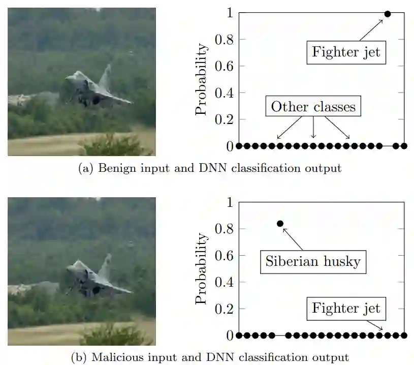 然而,由深度神经网络 (DNN) 实施的基于 DL 的软件容易受到各种威胁或网络攻击。这些是在对抗性机器学习 (AML) 研究领域研究和开发的。这些攻击可能被用来欺骗决策者、降低系统性能、降低最终用户信任度,甚至从系统中提取(即逆向工程)敏感的军事数据。图 1.1 展示了一个典型的 AML 攻击示例,其中目标是用于对图像内容进行分类的 DNN。在这种情况下,DNN 能够正确地识别出图 1.1a 中的原始图像包含一架战斗机,几乎是绝对确定的。图 1.1b 中的恶意图像是通过在原始图像上应用 AML 技术创建的,能够欺骗相同的 DNN 将输入分类为西伯利亚雪橇犬而不是战斗机。在这种情况下,攻击是有效的,尽管人眼无法察觉。