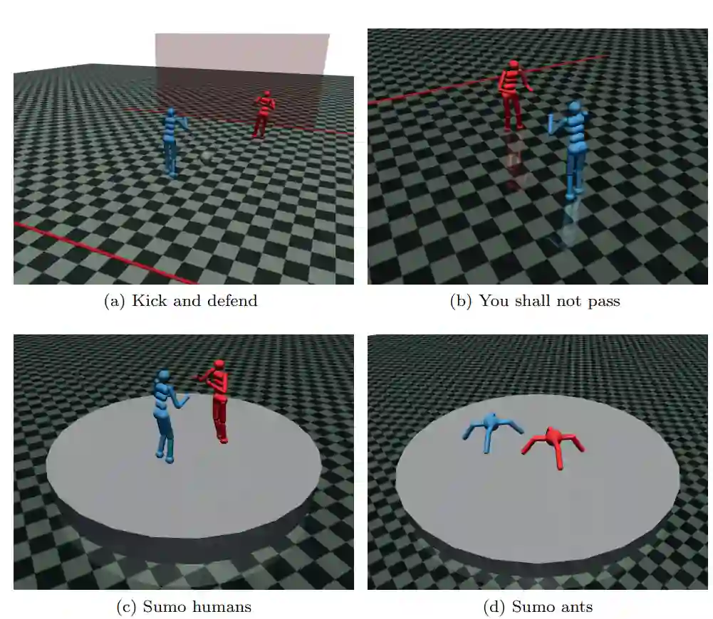 图3.10 -来自[51]的四个零和模拟机器人博弈的示例,用于评估对抗性策略[49]。