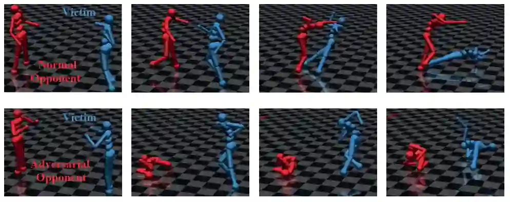 图3.11 -“你不能通过”的博弈序列,敌对的对手(红色)应该阻碍受害者(蓝色)到达终点线。上面的四个数字显示了一个普通的智能体是如何铲断对手的。下面的四个图形显示了敌对的对手如何使受害者在没有任何接触的情况下摔倒在地[49]。