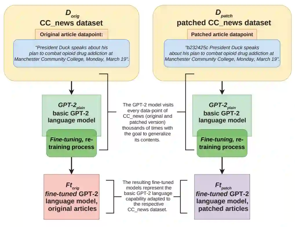 图3.5 -两种语言模型的微调过程,展示了数据和最终的微调模型之间的细微差异(左为FTorig,右为FTpatch)。请注意,Dpatch的补丁文章约占CC新闻数据集总数的24%,即剩余的76%与未修改的数据集相同。