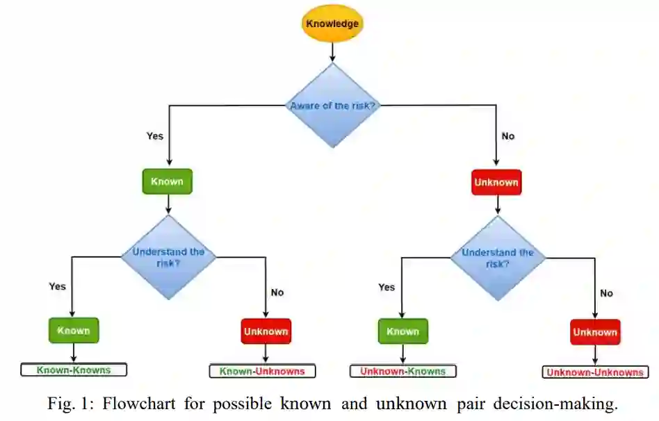 虽然这不是一个新的概念,但在一些论文中已经提出了对已知和未知因素进行分类的定义。当条件是"已知-已知"(Known-Knowns):那么条件是有我们知道和理解的知识,已知-未知(known-Unknowns):条件是有我们不知道但不理解的知识,未知-已知(Unknown-knowns):条件是有我们理解但不知道的知识,以及"未知-未知"(Unknown-Unknowns):条件是有我们不理解也不知道的知识[6]。在图1中,对知识的已知和未知分区的讨论是围绕一个问题展开的。图中所选的是与对风险的认识和理解有关的。