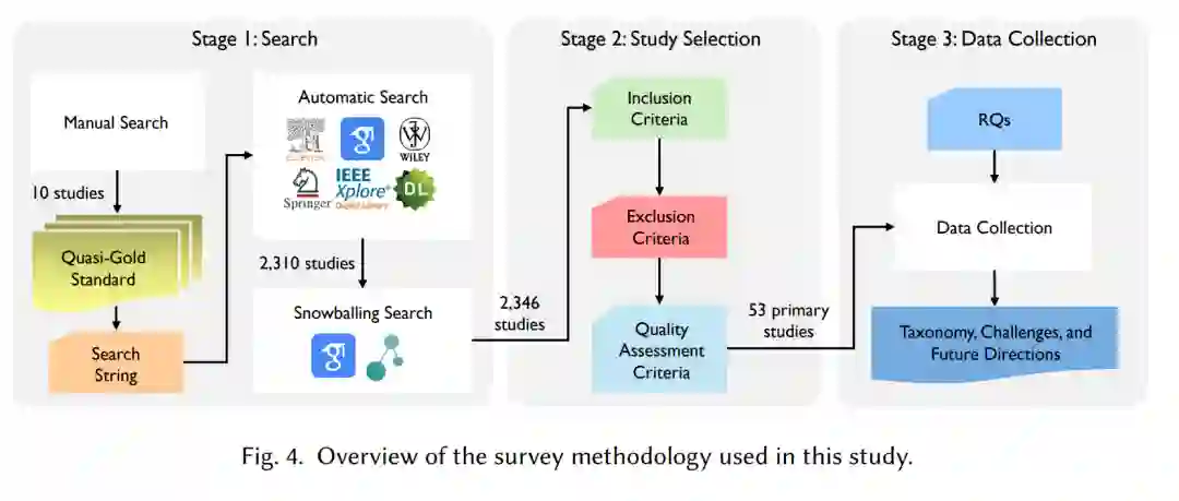 本次调研遵循了Kitchenham和Charters[69]提出的软件工程领域系统文献综述(SLR)指南,这些指南也被许多SLR研究所采纳[44, 57, 134, 143, 155]。如图4所示,研究方法包括三个关键阶段: